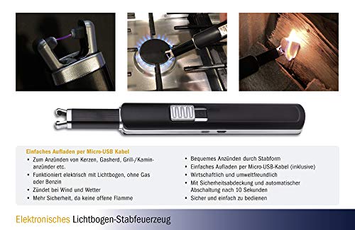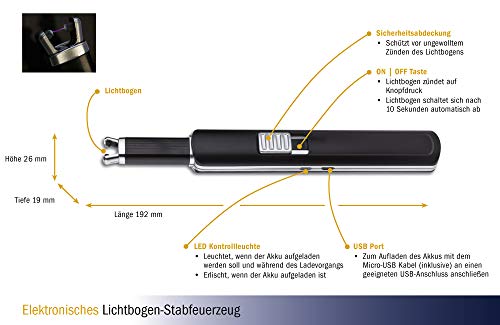 Specification: TFA Dostmann elektrische lichtboog-staafaansteker, 98.1119.01, oplaadbaar met micro USB kabel, werkt elektrisch, veilig en gemakkelijk in gebruik, met veiligheidsdekking, zwart, (L)192x(B)26x(H)19 mm
