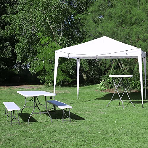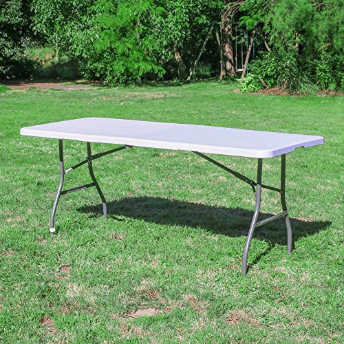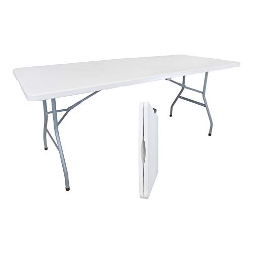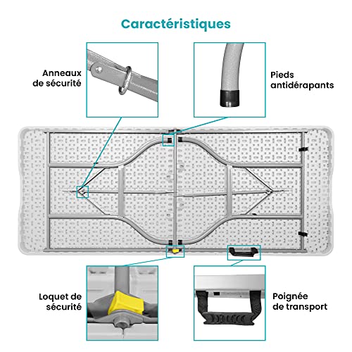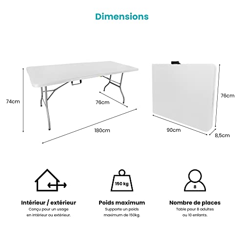 Grote afmetingen: uitgeklapt is deze bijzettafel 1,80 m lang, 76 cm breed en 74 cm hoog. De twee robuuste en antislip kunststof platen zijn in staat tot 8 personen (of 10 kinderen) te houden. Deze inklapbare tuintafel is de ideale bijzettafel voor kamperen, cocktails, bruiloften en ceremonies.
