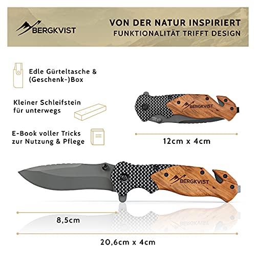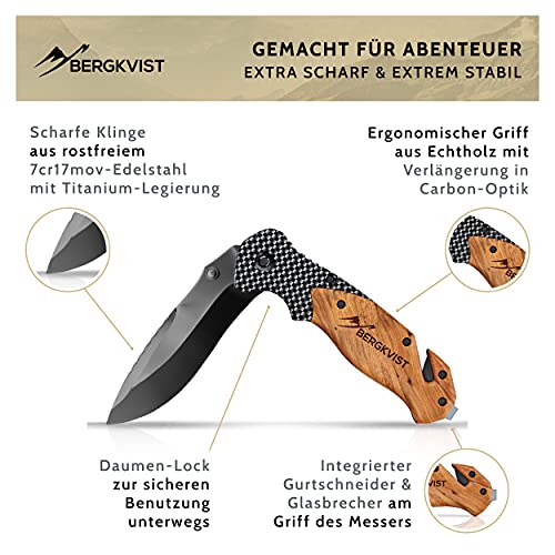 BERGKVIST K19 vouwmes (eenhandig mes) met houten handvat & titanium voor outdoor & survival – 3-in-1 zakmes met glasbreker & gordelsnijder