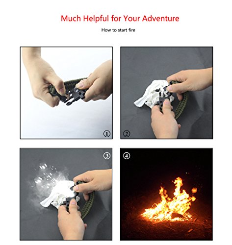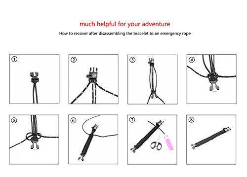 550 Grade Paracord: De armband kan worden gedemonteerd tot een 3,2 m lang touw met een diameter van 4 mm, en het kan tot 550 lbs ondersteunen die u betere veiligheidsgarantie geeft wanneer u in het wild bent, kunt u het gebruiken om te stoppen met bloeden, vallen te maken, tijdelijke tenten, hangmatten, zware voorwerpen te bundelen en meer